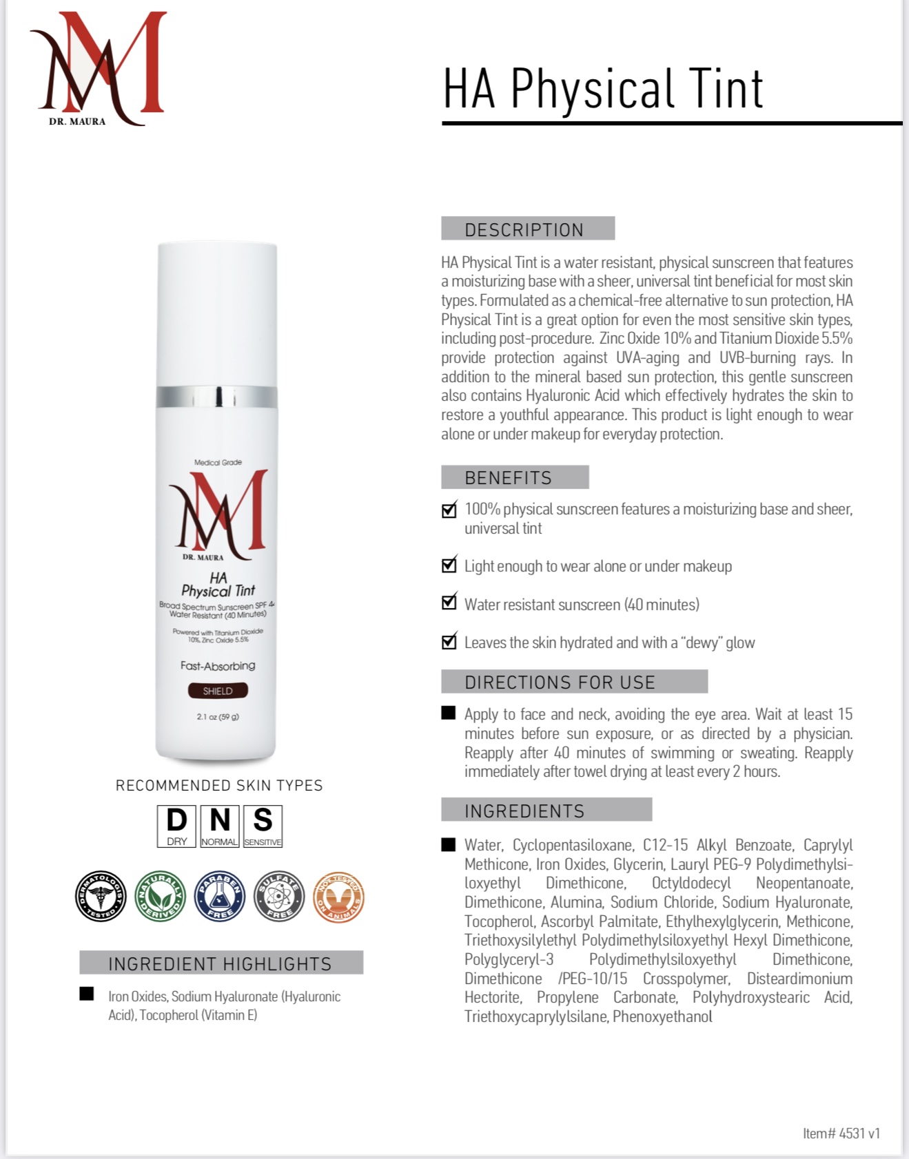 HA Physical Tint is a water resistant, physical sunscreen that features a moisturizing base with a sheer, universal tint beneficial for most skin types. Formulated as a chemical-free alternative to sun protection, HA Physical Tint is a great option for even the most sensitive skin types, including post-procedure. Zinc Oxide 10% and Titanium Dioxide 5.5% provide protection against UVA-aging and UVB-burning rays. In addition to the mineral based sun protection, this gentle sunscreen also contains Hyaluronic Acid which effectively hydrates the skin to restore a youthful appearance. This product is light enough to wear alone or under makeup for everyday protection.