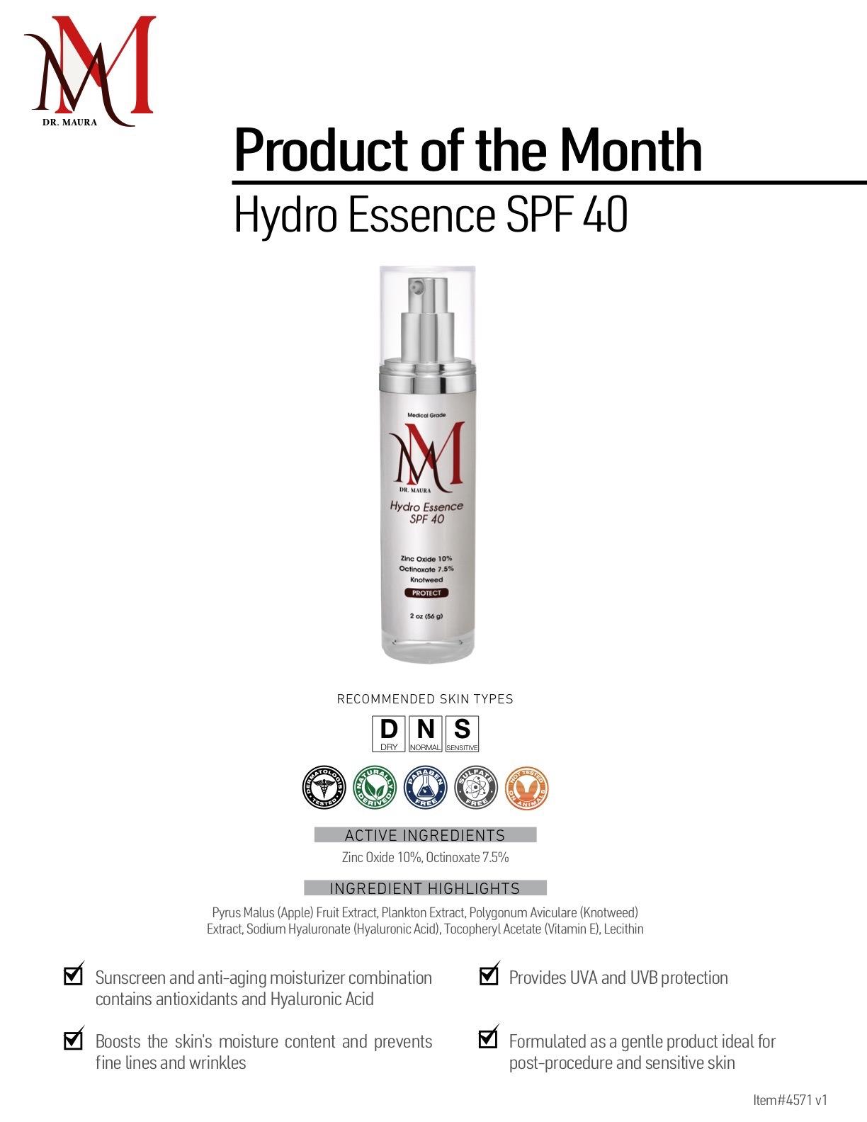 Combining the power of an anti-aging moisturizer with a broad-spectrum sunscreen, Hydro Essence SPF 40 is ideal for daily use to incorporate into any anti-aging regimen. This product combines moisturizing agents, antioxidants and Hyaluronic Acid to boost the skin’s moisture retention and prevent fine lines and wrinkles. In addition, Hydro Essence SPF 40 protects the skin against UVA-aging rays and UVB-burning rays. This sunscreen and moisturizer combination is formulated as a gentle product to accomodate sensitive skin and post-procedure recovery.