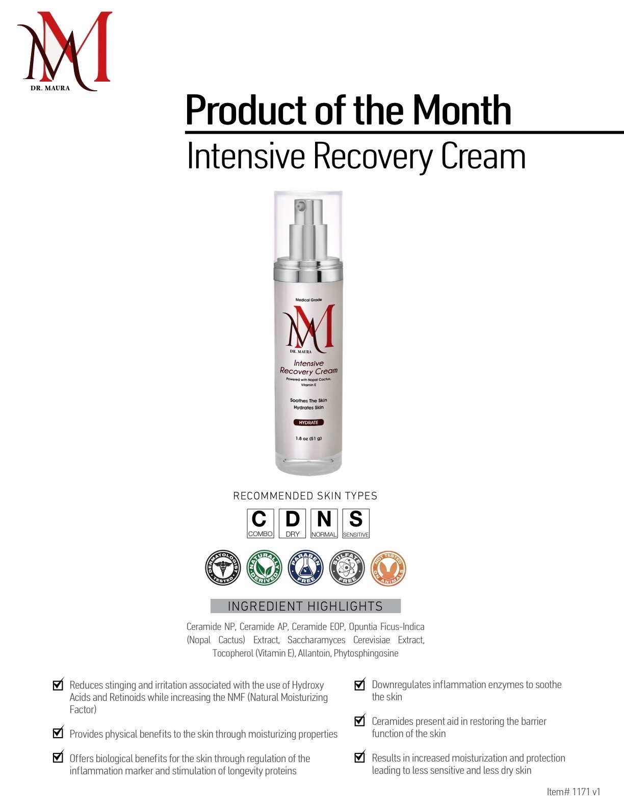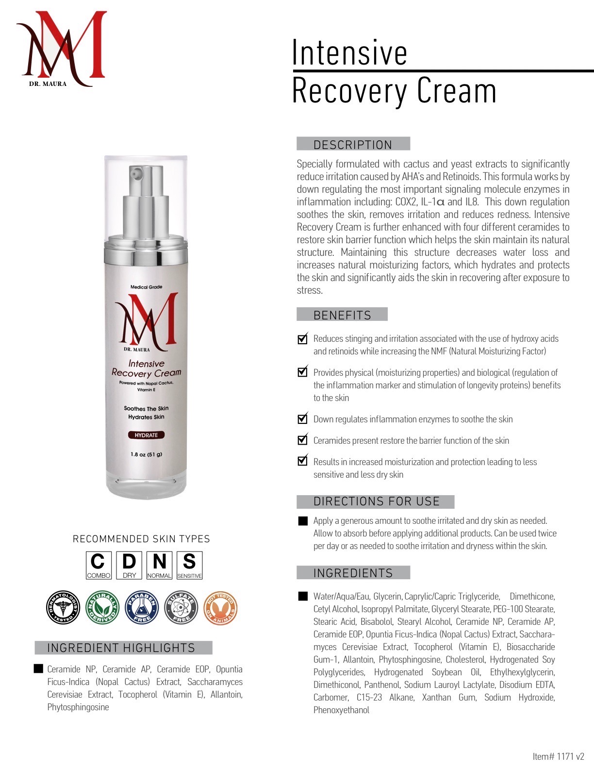 Specially formulated with cactus and yeast extracts to significantly reduce irritation caused by AHAs and Retinoids. This formula works by down regulating the most important signaling molecule enzymes in inflammation. This down regulation soothes the skin, removes irritation and reduces redness. Intensive Recovery Cream is further enhanced with four different ceramides to restore skin barrier function which helps the skin maintain its natural structure. Maintaining this structure decreases water loss and increases natural moisturizing factors, which hydrates and protects the skin and significantly aids the skin in recovering after exposure to stress.